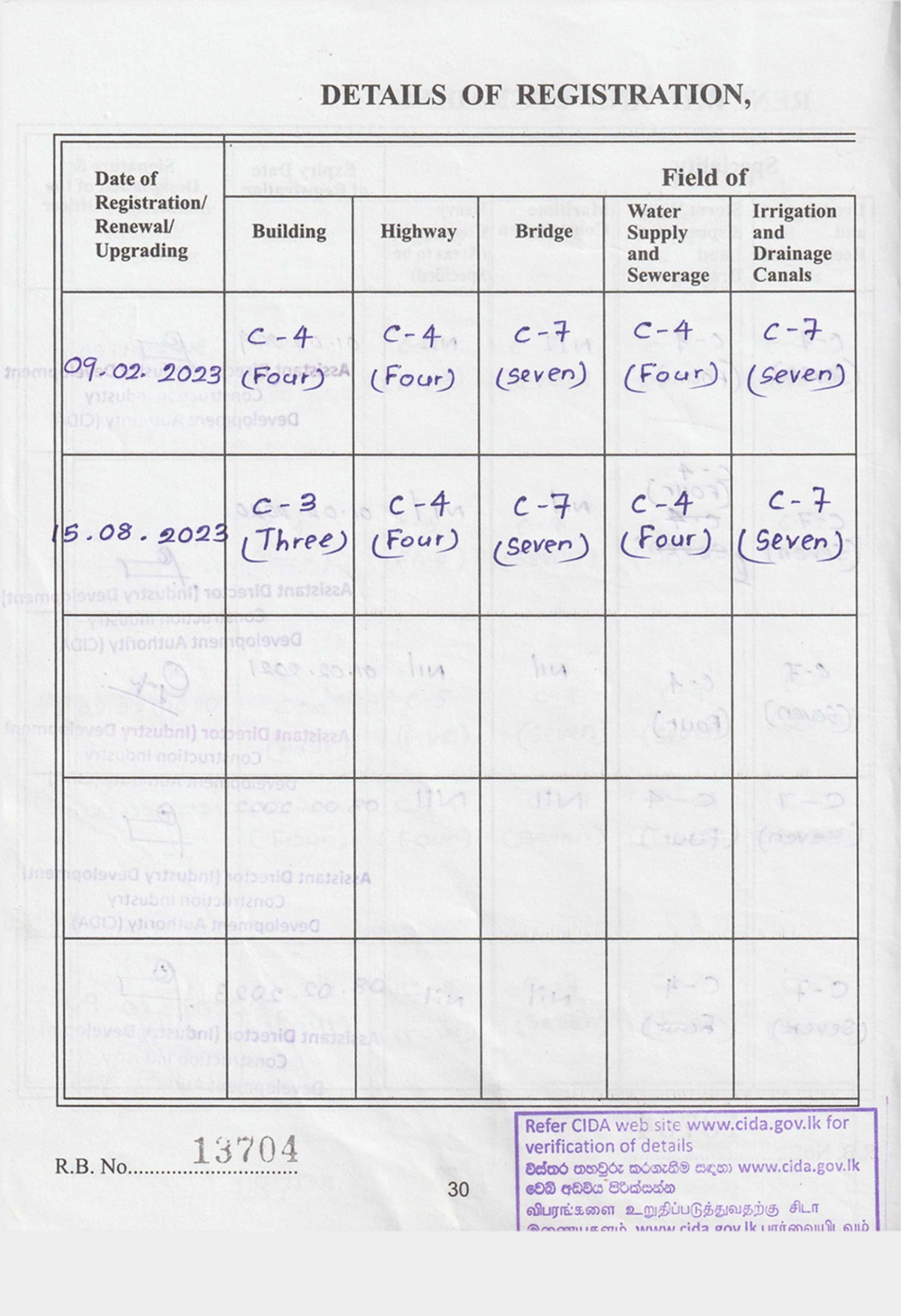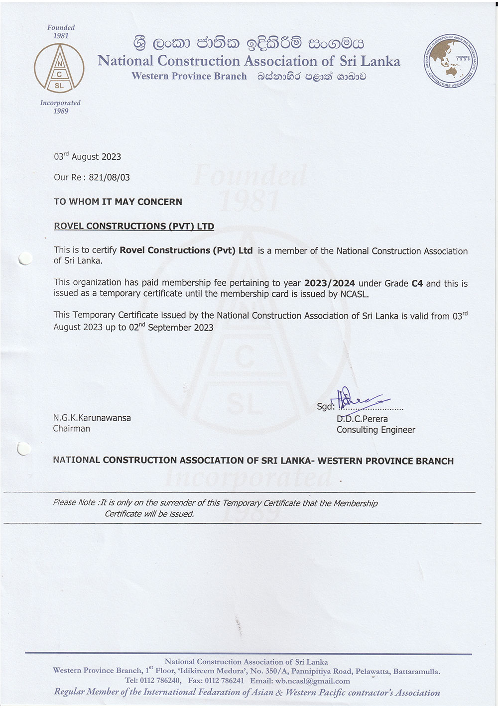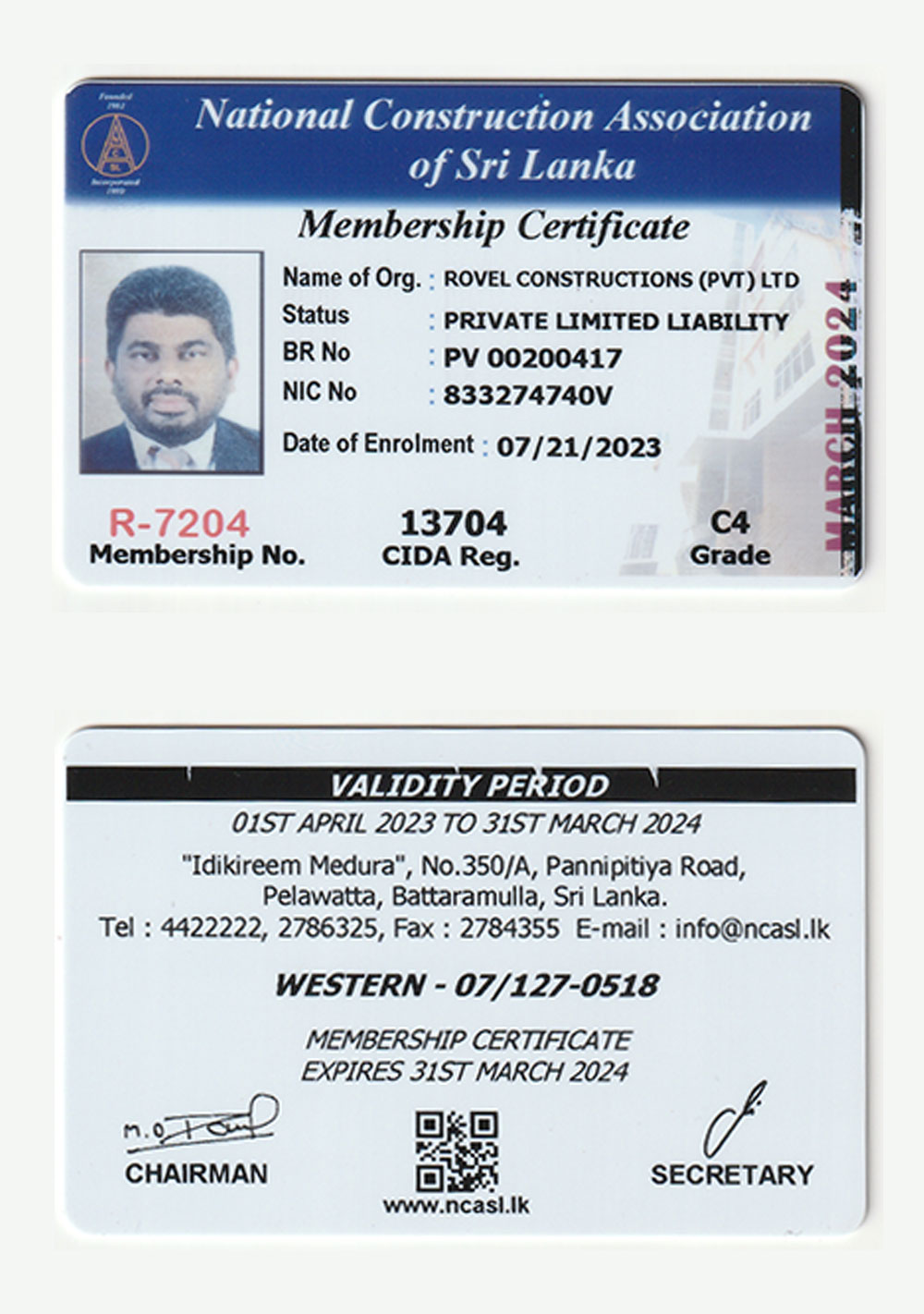As active members of the Construction Industry Development Authority and National Construction Association of Sri Lanka, we are deeply ingrained in the construction industry’s network and insights, ensuring that we stay at the forefront of industry advancements and best practices. This affiliation enhances our ability to provide innovative solutions and superior construction services.