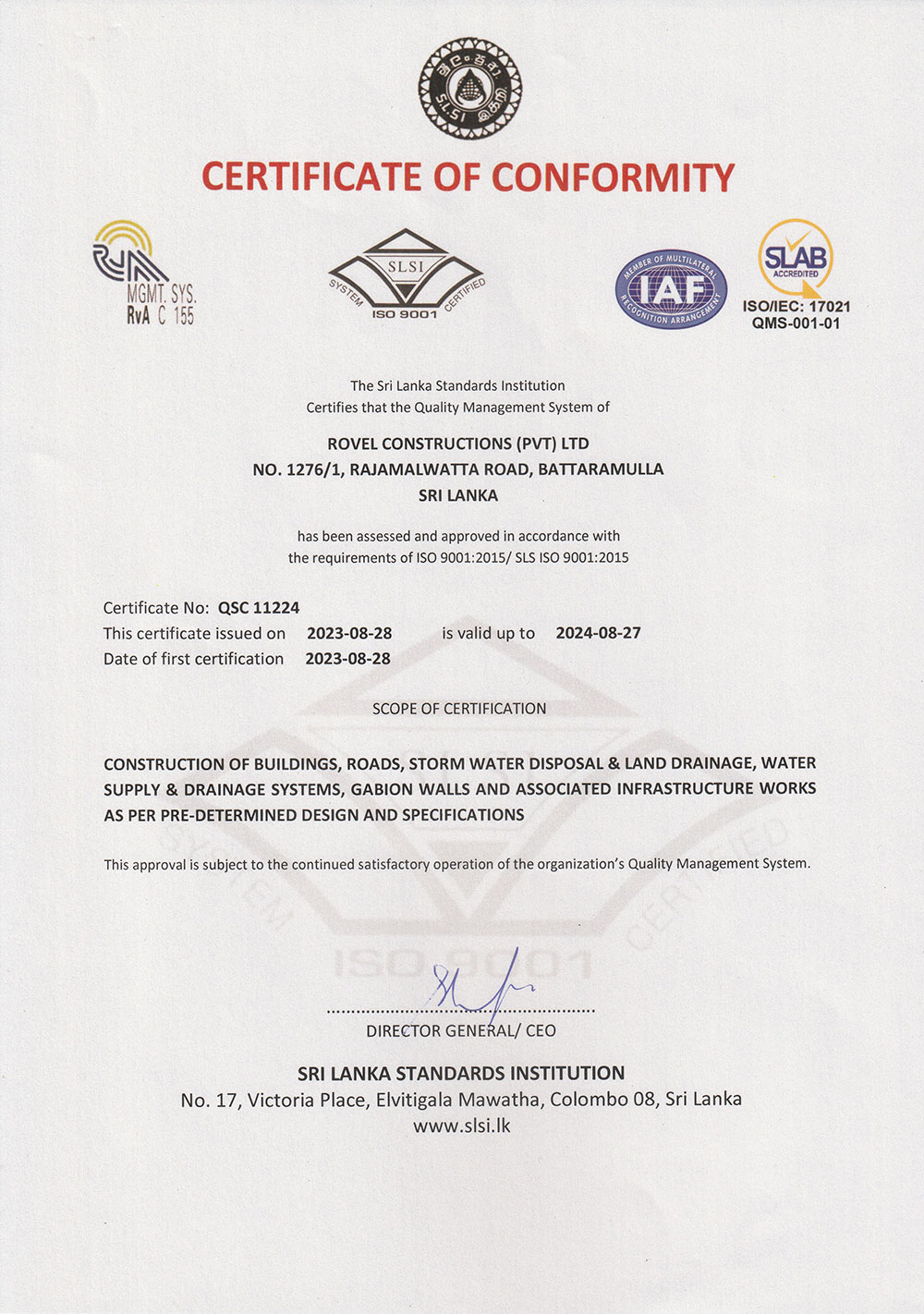 Rovel Constructions (Pvt) Ltd, a reputed construction company, proudly holds an CIDA Grade – C3 (Building) certification, signifying our expertise and competence in the field of building construction. We are committed to maintaining high-quality standards and have earned the Quality Management Certification – SLS 9001:2015 ISO 9001:2015, demonstrating our dedication to delivering top-notch construction projects that align with international quality management standards.